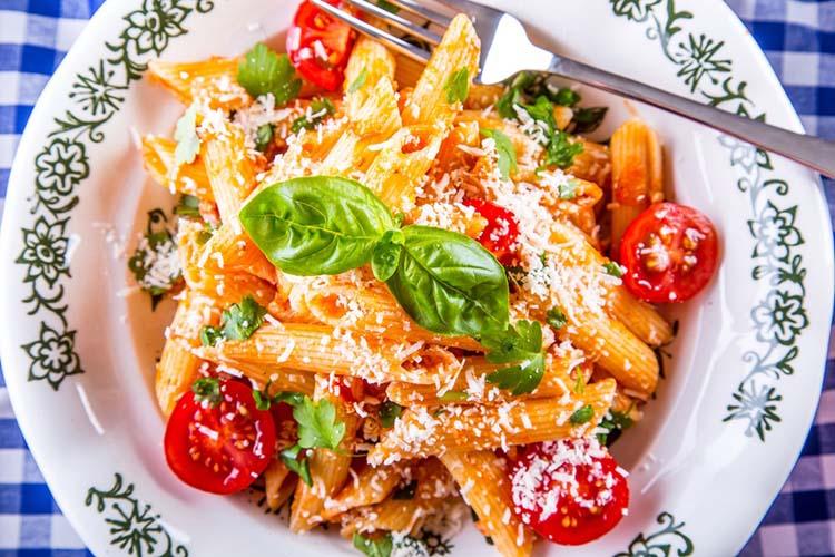 Tomate, Cebolla, Ajo, Vino blanco, Sal, Pimienta negra, Orégano, Aceite de Oliva, Pepinillos, Alcaparras, Aceitunas, Caldo (pollo o carne), Hojas Laurel. Penne Rigate.